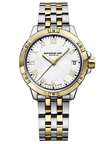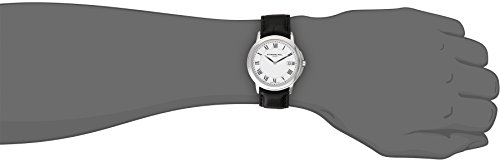- Round silver-tone watch with white dial, Roman numerals, and date window at 3:00