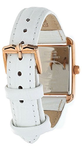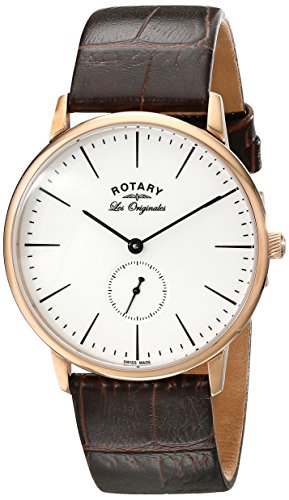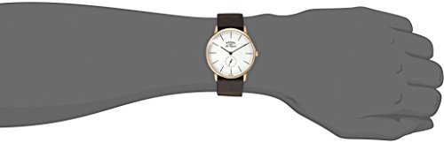 - Rose gold-tone watch featuring classic white dial with stick markers, minute track, and subdial