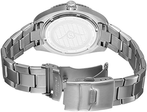 - Features include unidirectional ratcheting bezel, black hydraulically stamped box design dial with applied Arabic numerals and markers with date window at three o'clock position