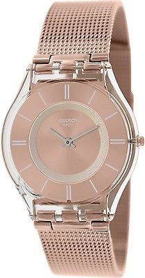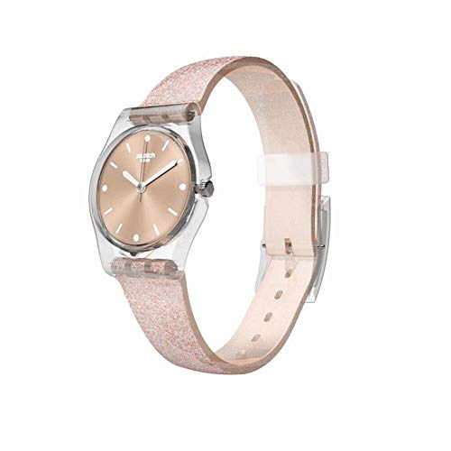 Translucent plastic case with a gold-colored glitter silicone strap. Fixed translucent plastic bezel. Rose gold dial with silver-tone hands and index hour markers. Dial Type: Analog. Quartz movement. Plexiglass crystal. Pull / push crown. Transparent case back. Round case shape. Case size: 25 mm. Case thickness: 7 mm. Band width: 12 mm. Tang clasp. Water resistant at 30 meters / 100 feet. Functions: hour, minute, second. Casual watch style. Swatch Pinkindescent Too Rose Gold Dial Ladies Watch LK354D.