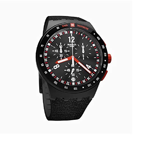 Black plastic case with a black silicone strap. Black dial with red hands and index hour markers. Tachymeter scale around the outer rim. Dial Type: Analog. Date display at the 6 o'clock position. Chronograph - sub-dials displaying: three - 60 second, 60 minute and 1/10th of a second. Quartz movement. Round case shape, case size: 42 mm, case thickness: 14.03 mm. Buckle clasp. Water resistant at 30 meters / 100 feet. Functions: chronograph, date, hour, minute, second. Swatch Stand Hall Chronograph Black Dial Men's Watch SUSB411.