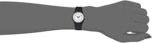 - Black plastic watch featuring round white dial with Arabic hour markers and luminous baton-shape hands