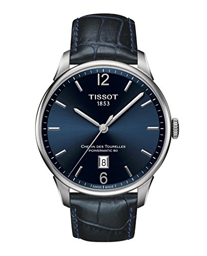 Silver-tone stainless steel case with a blue leather strap. Fixed silver-tone stainless steel bezel. Blue dial with silver-tone hands and index-Arabic numerals hour markers. Minute markers around the outer rim. Dial Type: Analog. Date display at the 6 o'clock position. Caliber Powermatic 80.111 automatic movement with an 80-hour power reserve. Scratch resistant sapphire crystal. Transparent case back. Round case shape, case size: 42 mm, case thickness: 10.9 mm. Band width: 21 mm. Deployment clasp. Water resistant at 50 meters / 165 feet. Functions: date, hour, minute, second. Casual watch style. Watch label: Swiss Made. Tissot Chemin Des Tourelles Blue Dial Automatic Men's Leather Watch T0994071604700.