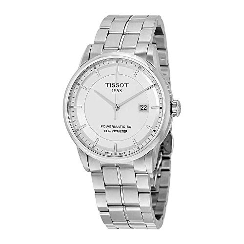 Silver-tone stainless steel case with a silver-tone stainless steel bracelet. Fixed silver-tone stainless steel bezel. Silver dial with silver-tone hands and index hour markers. Minute markers around the outer rim. Dial Type: Analog. Date display at the 3 o'clock position. Tissot Calibre Powermatic 80 (C07.111) automatic movement with an 80-hour power reserve. Scratch resistant sapphire crystal. Pull / push crown. Transparent case back. Round case shape, case size: 41 mm, case thickness: 9.75 mm. Band width: 22 mm, band length: 8 inches. Deployment with push button release clasp. Water resistant at 50 meters / 165 feet. Functions: date, hour, minute, second. Dress watch style. Watch label: Swiss Made. Item Variations: T086 408 11 031 00, T086-408-11-031-00, T086/408/11/031/00, T0864081103100. Tissot Luxury Automatic Silver Dial Men's Watch T086.408.11.031.00.