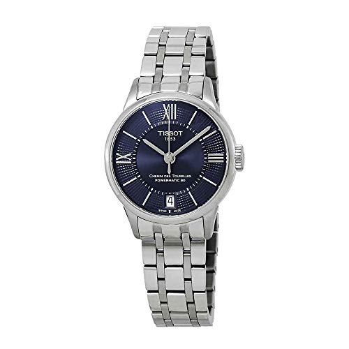 Silver-tone stainless steel case with a silver-tone stainless steel bracelet. Fixed silver-tone stainless steel bezel. Blue dial with silver-tone hands and Arabic numeral and index hour markers. Minute scale around the inner rim. Dial Type: Analog. Date display at the 6 o'clock position. Powermatic 80.111 automatic movement with an 80-hour power reserve. Scratch resistant sapphire crystal. Transparent case back. Round case shape, case size: 32 mm, case thickness: 10.7 mm. Band width: 16 mm. Deployment clasp. Water resistant at 50 meters / 165 feet. Functions: date, hour, minute, second. Casual watch style. Watch label: Swiss Made. Tissot Chemin Des Tourelles Automatic Blue Dial Ladies Watch T099.207.11.048.00.