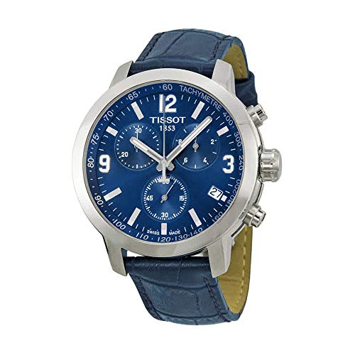 - Blue-dial watch with chronograph featuring date window and tachymeter printed on bezel
