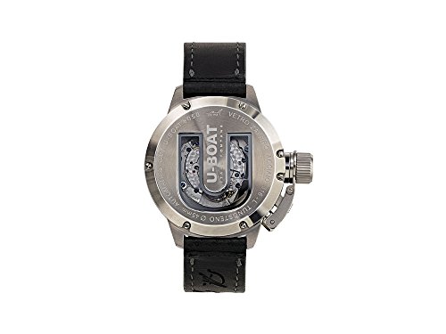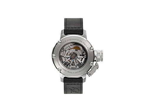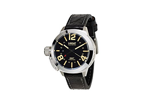 U-Boat Classico Automatic Watch, Movement: Automatic, Jewels: 21 jewels, Frequency: 28800 A/h, Power Reserve: 42 Hours, Case Material: Stainless Steel 316L, Tungsten, Crystal: Sapphire, Case Back Crystal: Sapphire Glass, Dial color: Black, Diameter: 45 mm, GMT: GMT, Calendar type: Day, Crown: Patented crown protection system, Case back: Screw-fastened, Water resistant depth: 10 atm, Strap: Leather, Band color: Black, Band width: 20 mm., Clasp type: Buckle, Clasp Material: Stainless Steel, Warranty: 2 years, Country of Manufacture: Italy