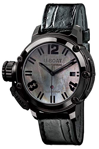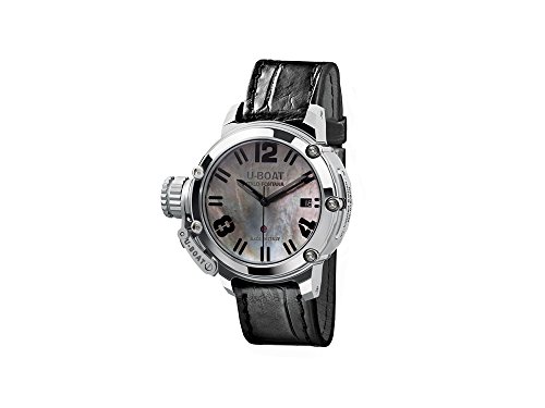 U-Boat Chimera Automatic Watch, Movement: Automatic, Jewels: 25 jewels, Frequency: 28800 A/h, Power Reserve: 38 Hours, Case Material: Stainless Steel 316L, Dial Material: Mother of pearl, Crystal: Anti-reflective Sapphire, Case Back Crystal: Sapphire Glass, Diameter: 40 mm, Calendar type: Day, Crown: Patented crown protection system, Water resistant depth: 10 atm, Strap: Alligator, Band color: Black, Band width: 18 mm., Clasp type: Buckle, Clasp Material: Stainless Steel, Limited Edition: 300 units, Warranty: 2 years, Country of Manufacture: Italy