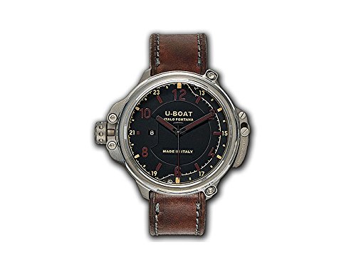 U-Boat Capsule Automatic Watch, Movement: Automatic, Jewels: 25 jewels, Frequency: 28800 A/h, Power Reserve: 38 Hours, Case Material: Titanium, Crystal: Sapphire, Dial color: Black, Lume Material: Superluminova, Lume components: Hands and indices, Diameter: 50mm, Thickness: 23,3 mm., Calendar type: Day, Crown: Patented crown protection system, Case back: Screw-fastened, Water resistant depth: 10 atm, Strap: Leather, Band color: brown, Band width: 23mm., Clasp type: Buckle, Clasp Material: Titanium, Limited Edition: 288 units, Warranty: 2 years, Country of Manufacture: Italy