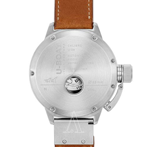 U-Boat Capsule Automatic Watch, Movement: Automatic, Jewels: 25 jewels, Frequency: 28800 A/h, Power Reserve: 38 Hours, Case Material: Titanium, Crystal: Sapphire, Dial color: Beige, Lume Material: Superluminova, Lume components: Hands and indices, Diameter: 50mm, Thickness: 23,3 mm., Calendar type: Day, Crown: Patented crown protection system, Case back: Screw-fastened, Water resistant depth: 10 atm, Strap: Leather, Band color: brown, Band width: 23mm., Clasp type: Buckle, Clasp Material: Titanium, Limited Edition: 288 units, Warranty: 2 years, Country of Manufacture: Italy