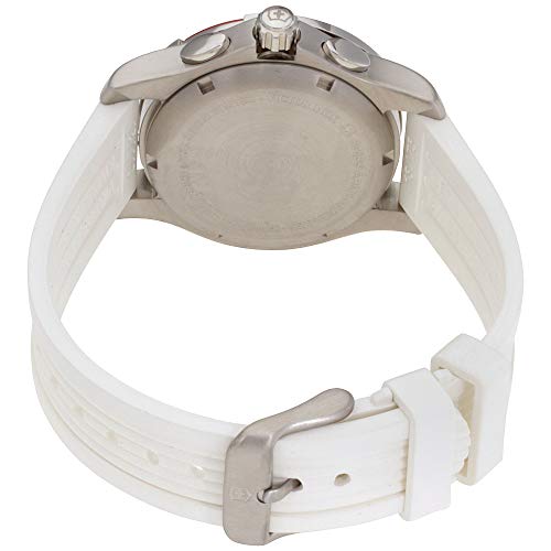 - Quartz movement<br />Stainless steel case<br />White chronograph dial<br />White rubber strap<br />Pin buckle<br />