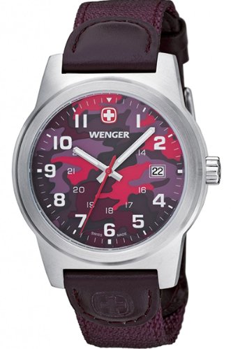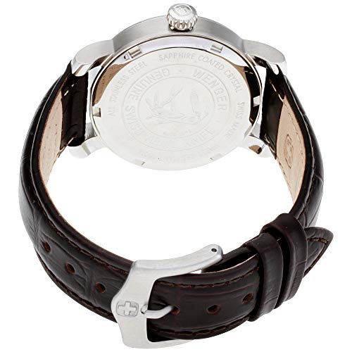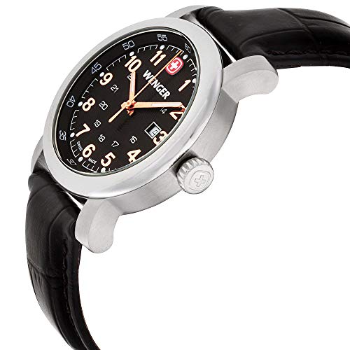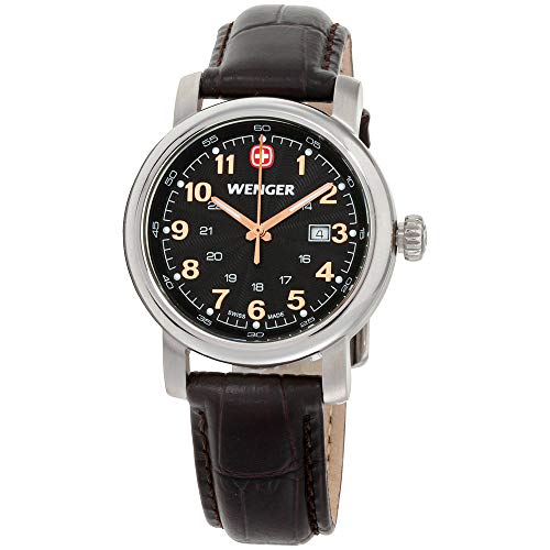 Wenger 01.1021.104 Urban Classic women's watch features a 34mm wide and 7mm thick solid stainless steel case with a fixed bezel and textured push-pull crown. Wenger 01.1021.104 is powered by Swiss Made Ronda 585 quartz movement. This beautiful watch also features a textured black dial with white accents rose gold tone luminous hands and Arabic numeral hour markers along with the 12/24-hour time and date display functions, scratch resistant mineral crystal and water resistant to 100 meters. Wenger 01.1021.104 is equipped with a 17mm wide brown leather strap with a buckle clasp. Wenger 01.1021.104 women's Urban Classic black dial brown leather strap watch is brand new and comes in an original Wenger gift box and is backed by a 3 year limited warranty.