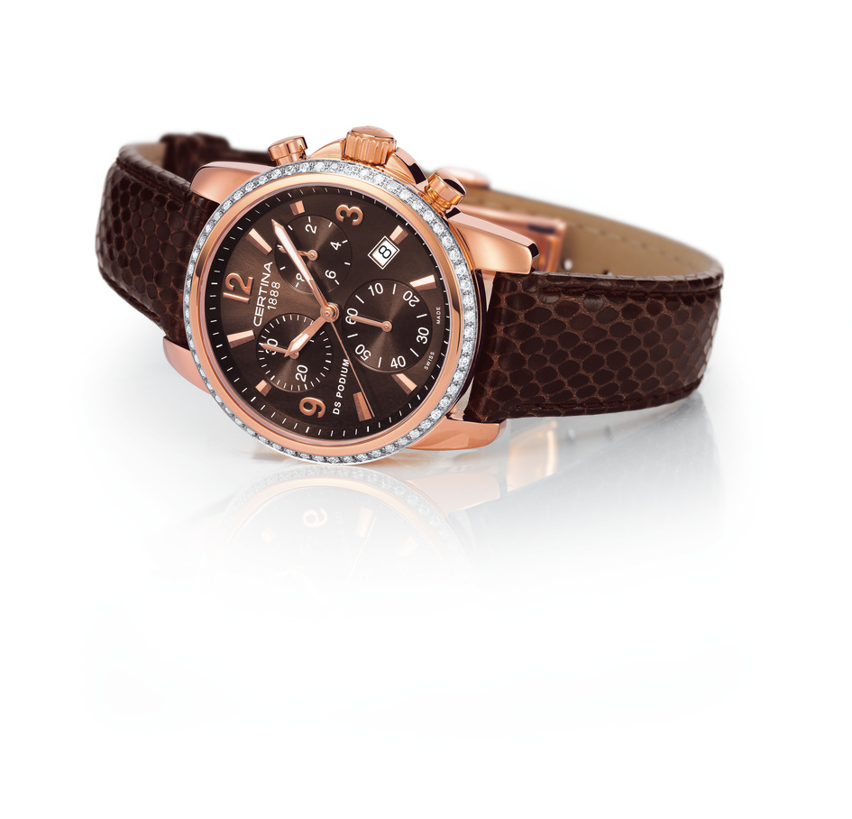 Certina's DS Podium Chrono Diamonds is an object of great femininity and elegance, an exquisite timepiece that brings precision to a woman's busy schedule. The rose-gold PVD steel case, gorgeous brown sunray dial and bright halo of 60 Top Wesselton diamonds capture every glance, day or night. But the DS Podium Chrono is not only a delight to behold, it is a highly precise timepiece with a full complement of hours, minutes, small seconds and date, and impeccable chrono timing with three easy-to-read counters.