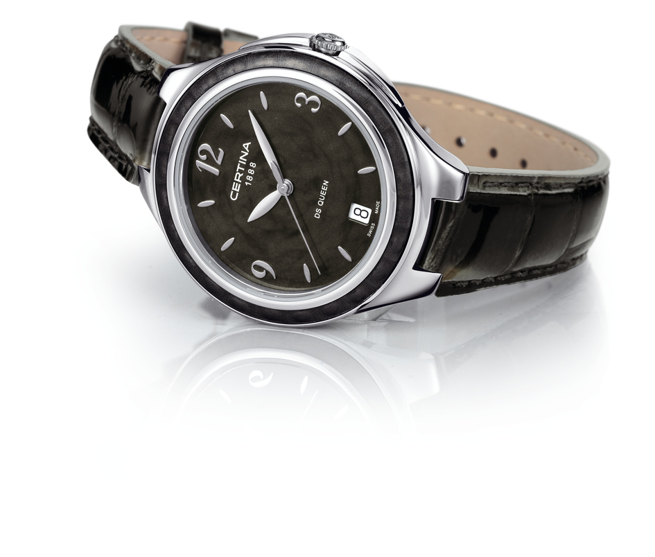 Housed in a comfortable 36 mm fully-polished stainless steel case embellished by sensuous HyCeram, the DS Queen's trustworthy ETA movement provides a full complement of hours, minutes, central seconds and date. Gently feminine and rounded HM hands, indices and Arabic numerals tell time with grace and bit of art, against a dial in either mysterious anthracite black or marbled white. A sapphire crystal and the CERTINA DS Concept protect this gorgeous timepiece up to a pressure of 10 bar (100 m), as evidenced by the letters DS on the tip of its protected crown. Black, white or red models are available, with a sporty leather strap in matching colour, closed by a standard buckle. A steel-bracelet version is also available.